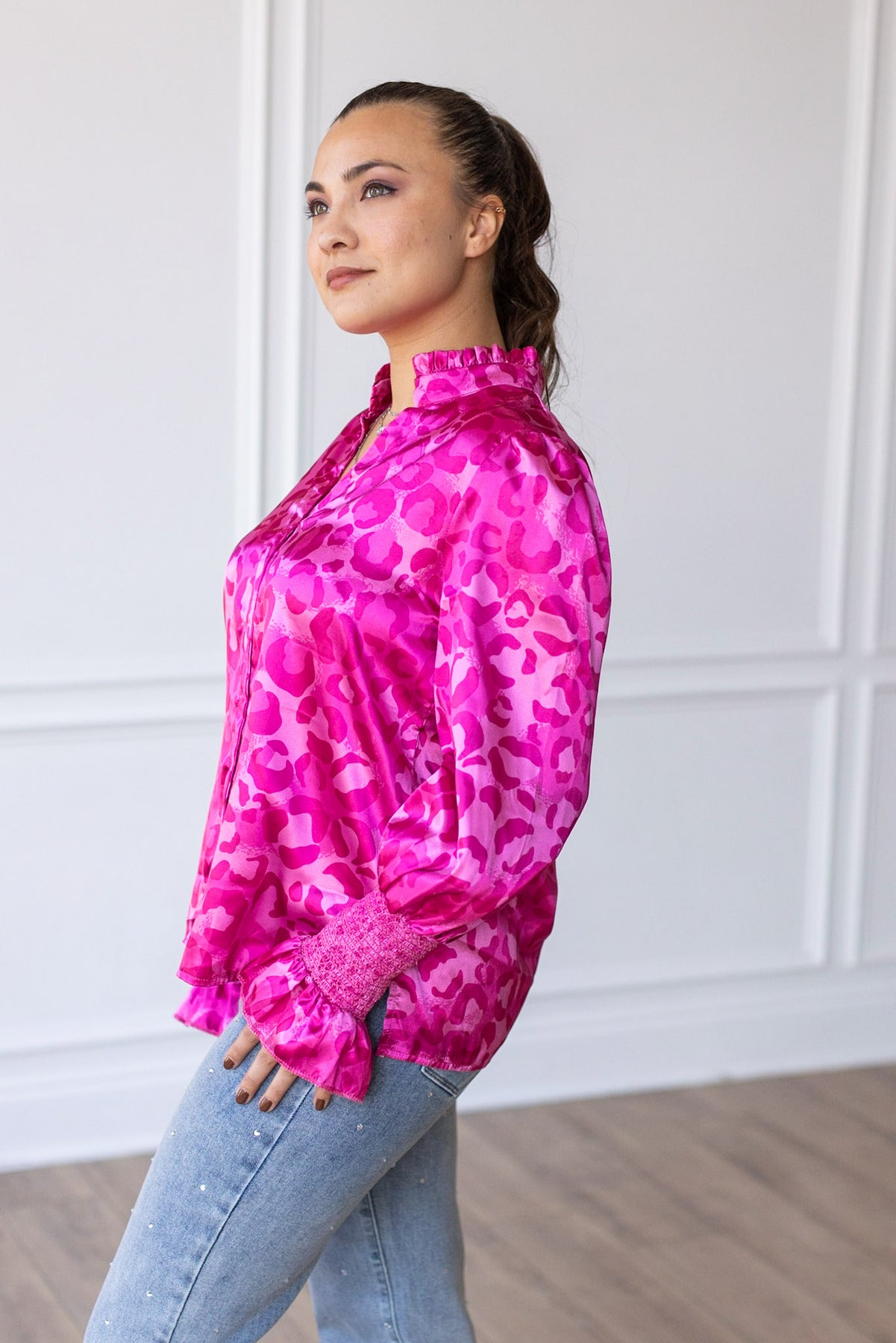 Indulge in the allure of our "Smitten in Satin Leopard Pink Top," a striking blend of bold design and feminine charm. The pink satin is adorned with a captivating leopard print, infusing a touch of wild sophistication into your wardrobe. Elevating the allure, the smocked cuffs add a whimsical detail, ensuring a perfect fit while maintaining an air of romance. Embrace your adventurous style with this satin beauty, perfect for making a bold statement on any occasion.