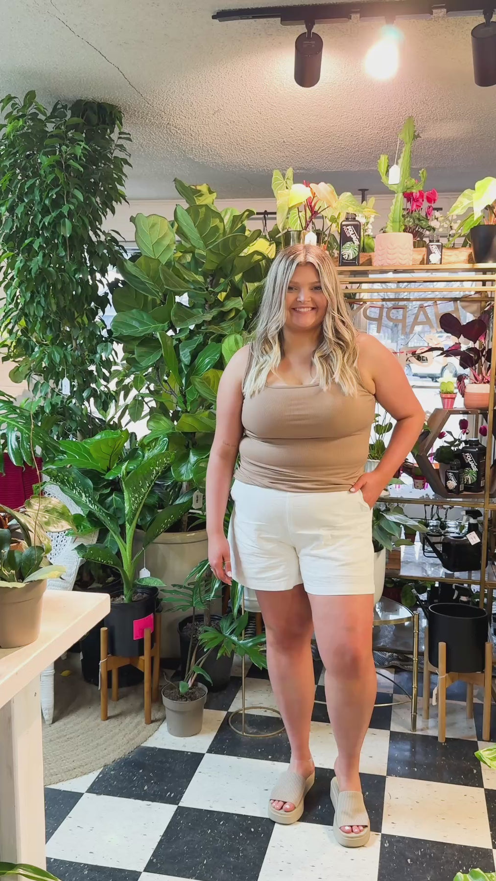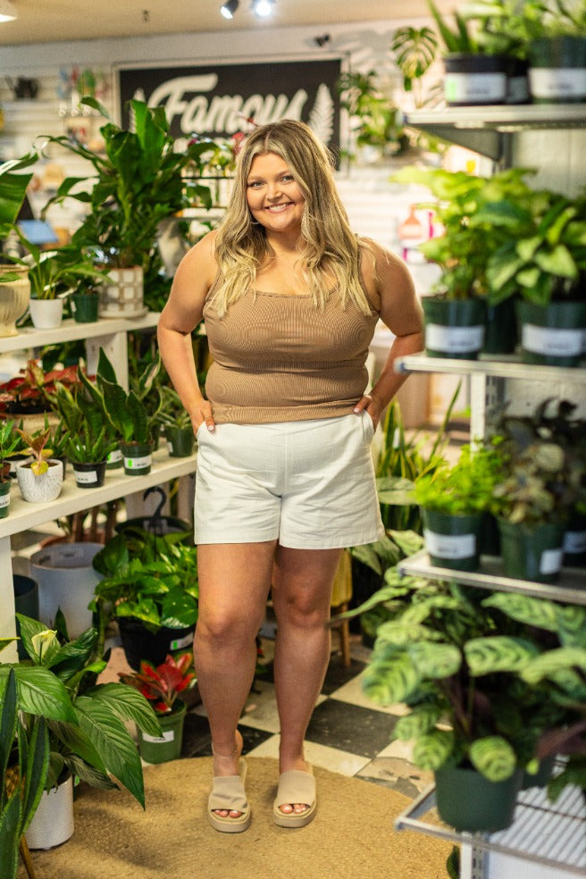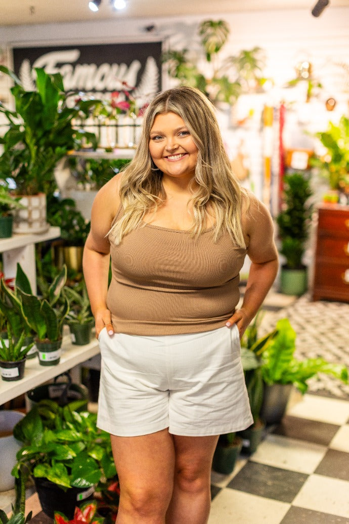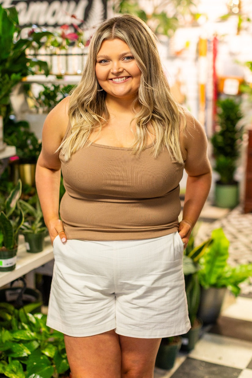 This rib knit tank top features a structured square neckline and a relaxed, mom crop fit that sits comfortably without clinging. Made with high-stretch fabric, it moves with the body while offering gentle support. The unlined finish keeps it lightweight and breathable—perfect for everyday ease with a soft, body-flattering silhouette.