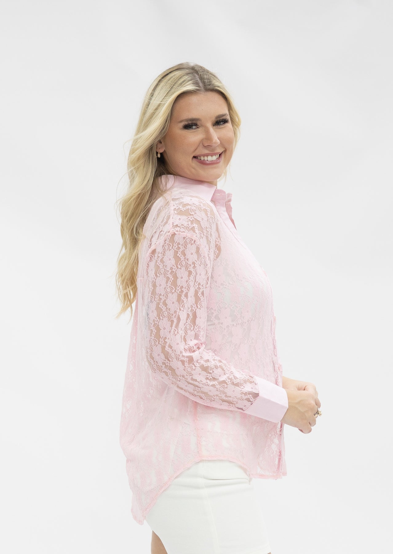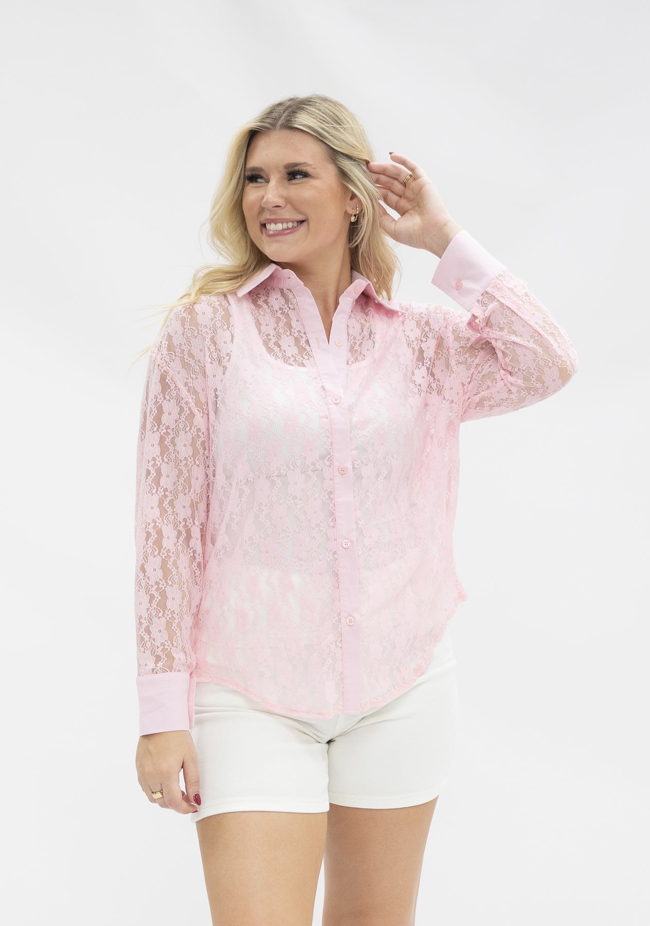 Add a touch of elegance to your everyday look with our Kathryn Classic Button-Up in Lace. This sophisticated top features a delicate floral lace face with a classic collared neckline and button-front closure. Designed with sheer long sleeves and a lightweight, breathable fit, it's perfect for layering over camis or bralettes for a subtly sultry vibe. Dress it up with trousers or keep it casual with denim—either way, this blouse is a wardrobe must-have.