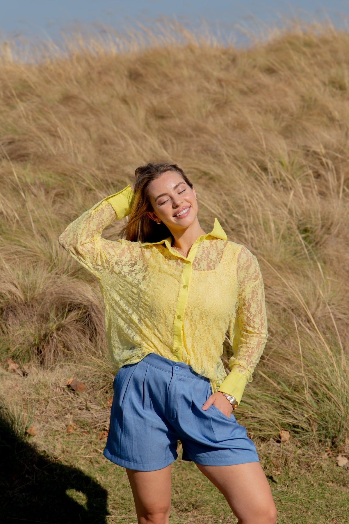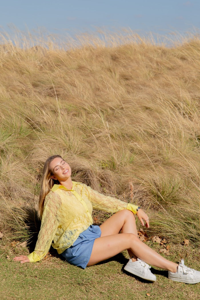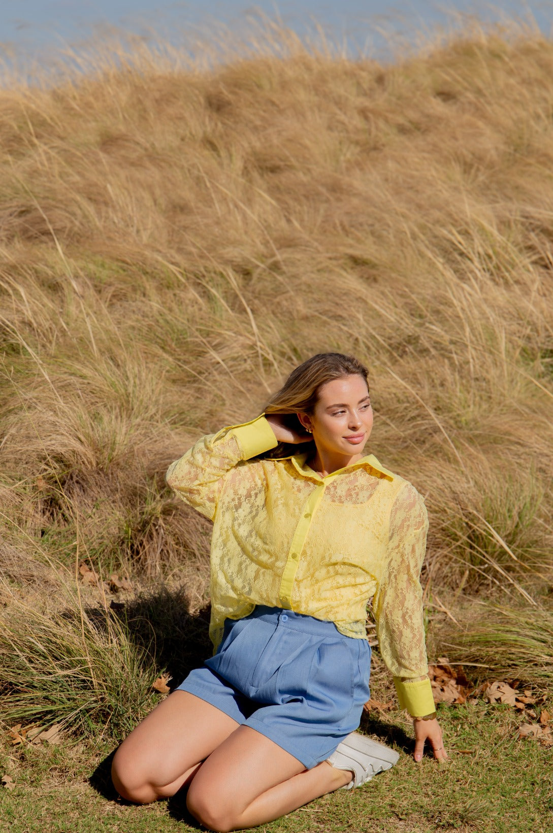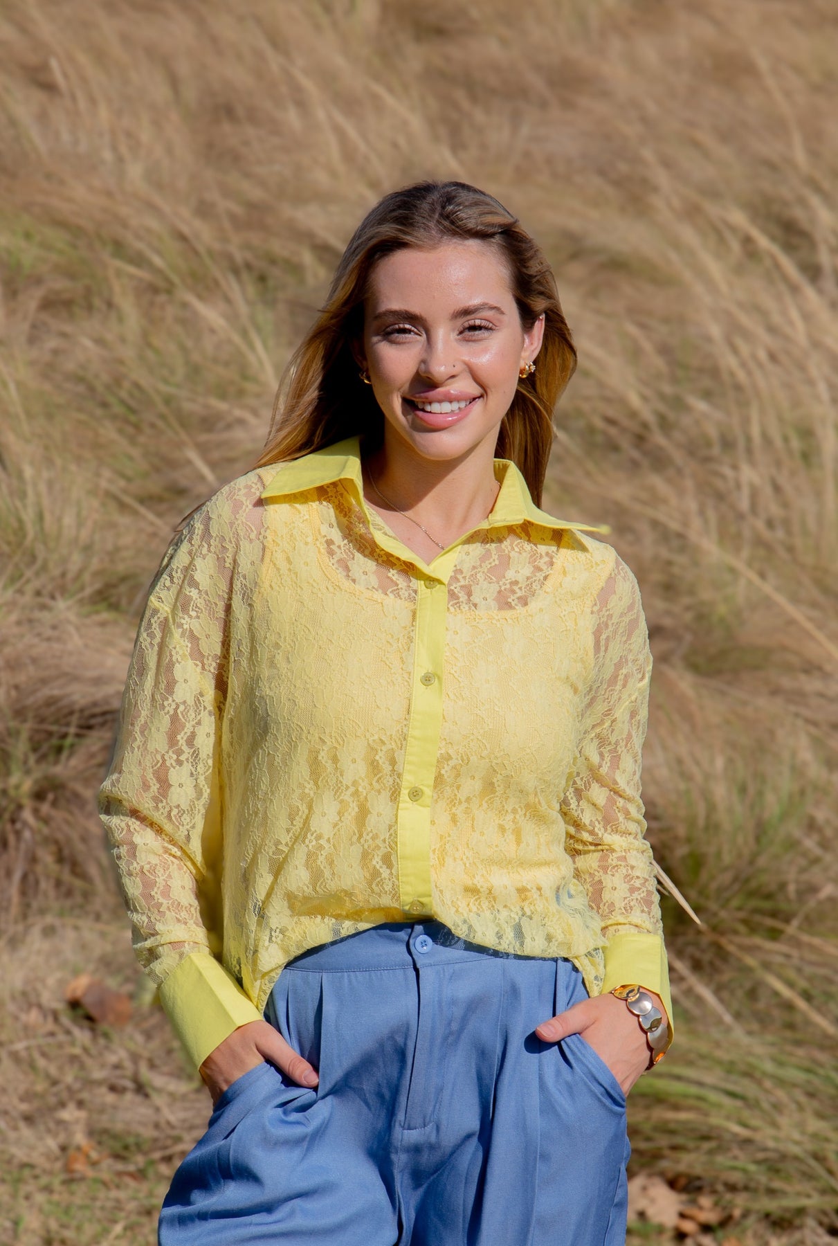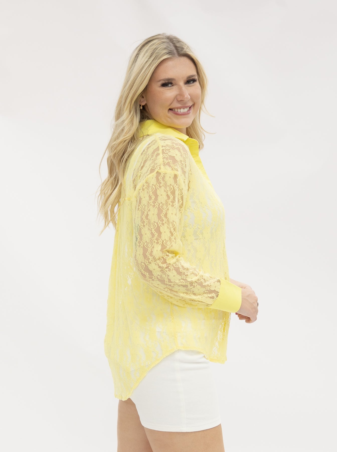 Add a touch of elegance to your everyday look with our Kathryn Classic Button-Up in Lace. This sophisticated top features a delicate floral lace face with a classic collared neckline and button-front closure. Designed with sheer long sleeves and a lightweight, breathable fit, it's perfect for layering over camis or bralettes for a subtly sultry vibe. Dress it up with trousers or keep it casual with denim—either way, this blouse is a wardrobe must-have.