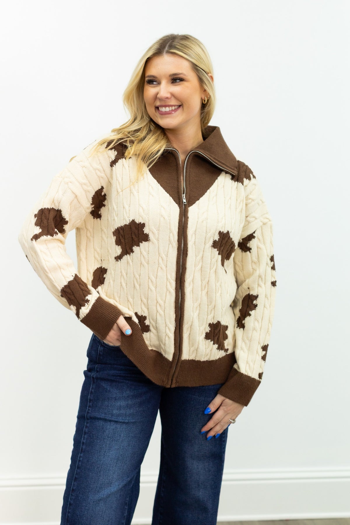 Bring a touch of Western charm to your wardrobe with our Zip Cow Print Sweater. Featuring a cozy cream knit base with a bold brown cow print pattern, this sweater blends rustic style with modern comfort. The cable knit texture adds dimension, while the half-zip neckline offers versatile styling—wear it zipped up for extra warmth or open for a casual look. Finished with contrast ribbed cuffs and hem, it's the perfect piece for pairing with denim and boots all season long.
