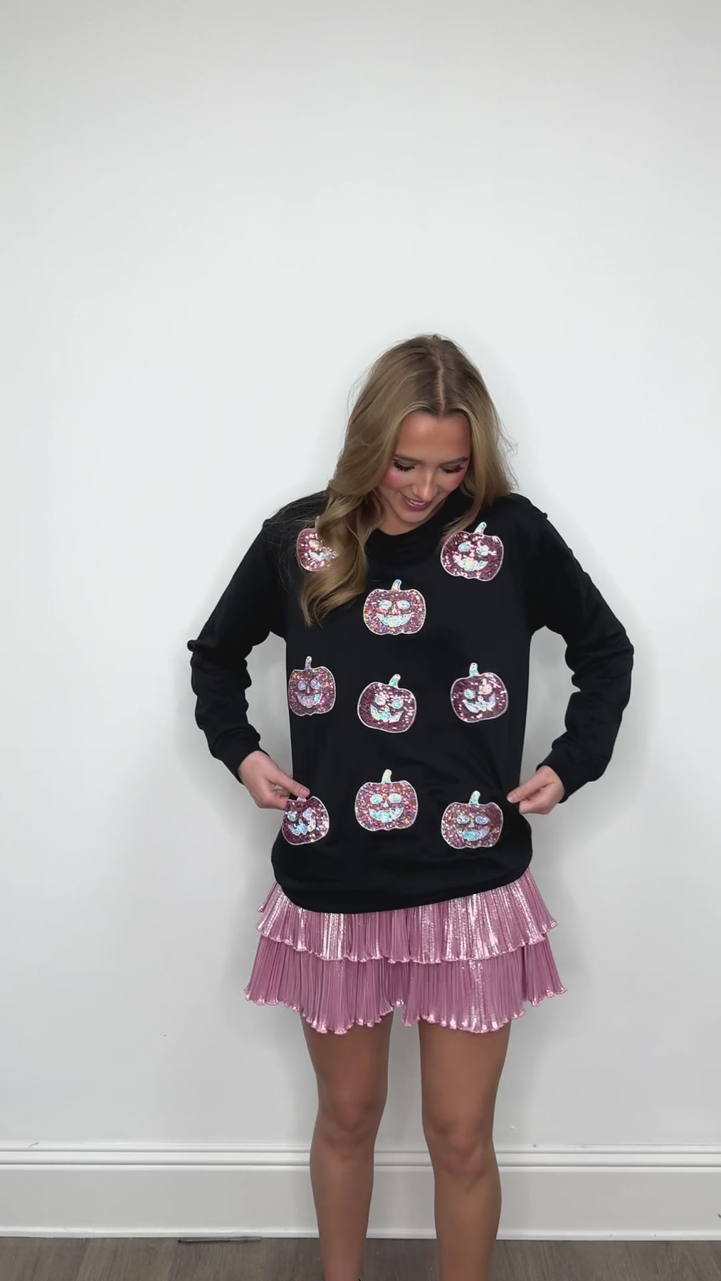 This relaxed long-sleeve tee brings a fun seasonal touch with its glittering sequin pumpkin detail—subtly festive and easy to wear. Made from a soft fabric with gentle stretch, it's designed for all-day comfort. Finished with a classic crew neckline and a laid-back fit, it's the perfect piece to add a little sparkle to your fall wardrobe while keeping things simple and cozy