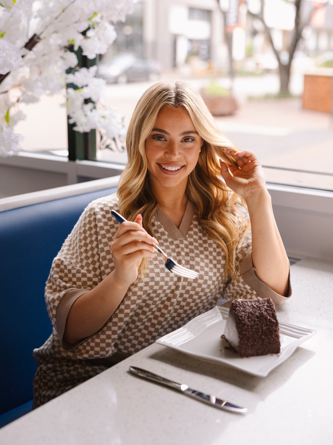 This checkerboard knit top offers a relaxed fit with high-stretch fabric that moves with you for all-day comfort. Featuring a flattering V-neck and a trendy mom crop length, it's the perfect blend of casual style and modern edge. Lightweight and unlined, it layers beautifully or stands out on its own.